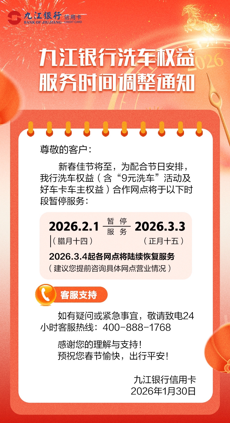 九江銀行洗車權(quán)益服務(wù)時(shí)間調(diào)整通知